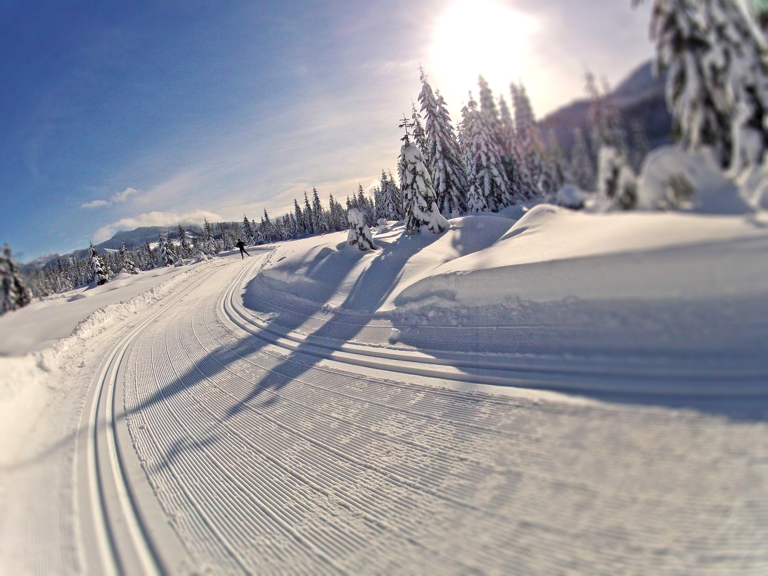 Lakes and streams freeze over in the high-country. Rain turns to snow and the woods begin the annual transformation from greens to whites. Many trails that were easy passage in the summer become entirely different contours under feet of snow. Skis become the ideal mode of pedestrian transport over this new mountain canvas. Explore Western Washington Nordic Skiing Trail Systems and Shoulder-season back country ski routes below on this page.